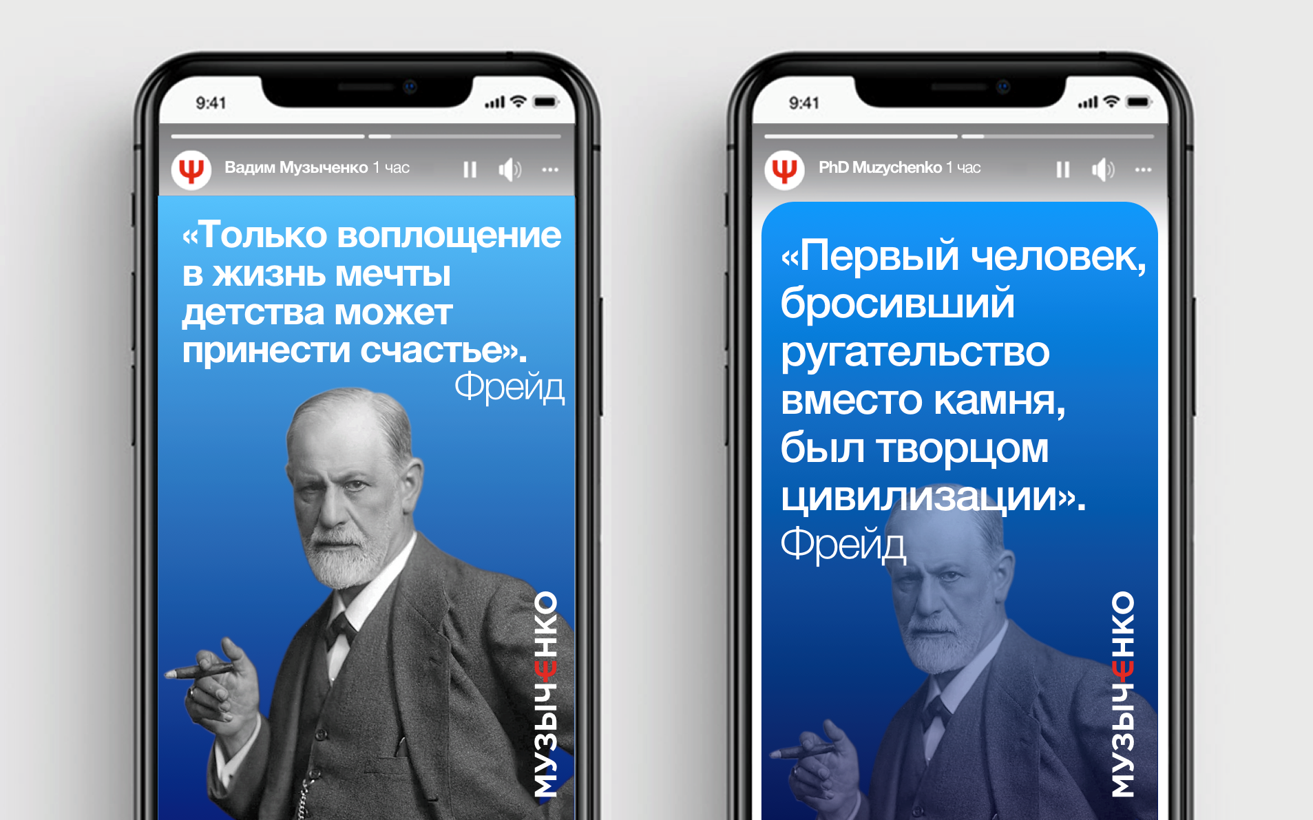 Система візуальної ідентификації, дизайн-концепція для соціальних мереж. Головний візуальний елемент логотипу – грецька літера Ψ (псі) вважається символом психології.